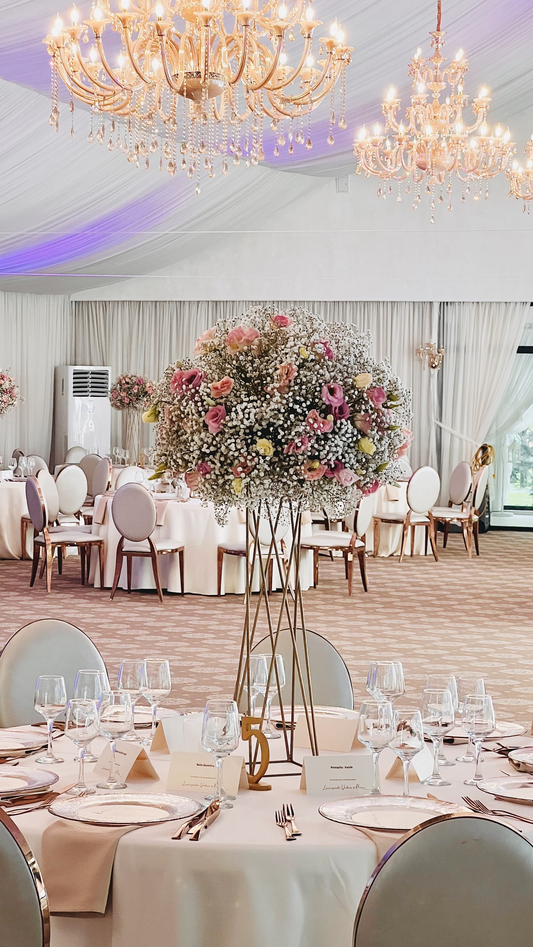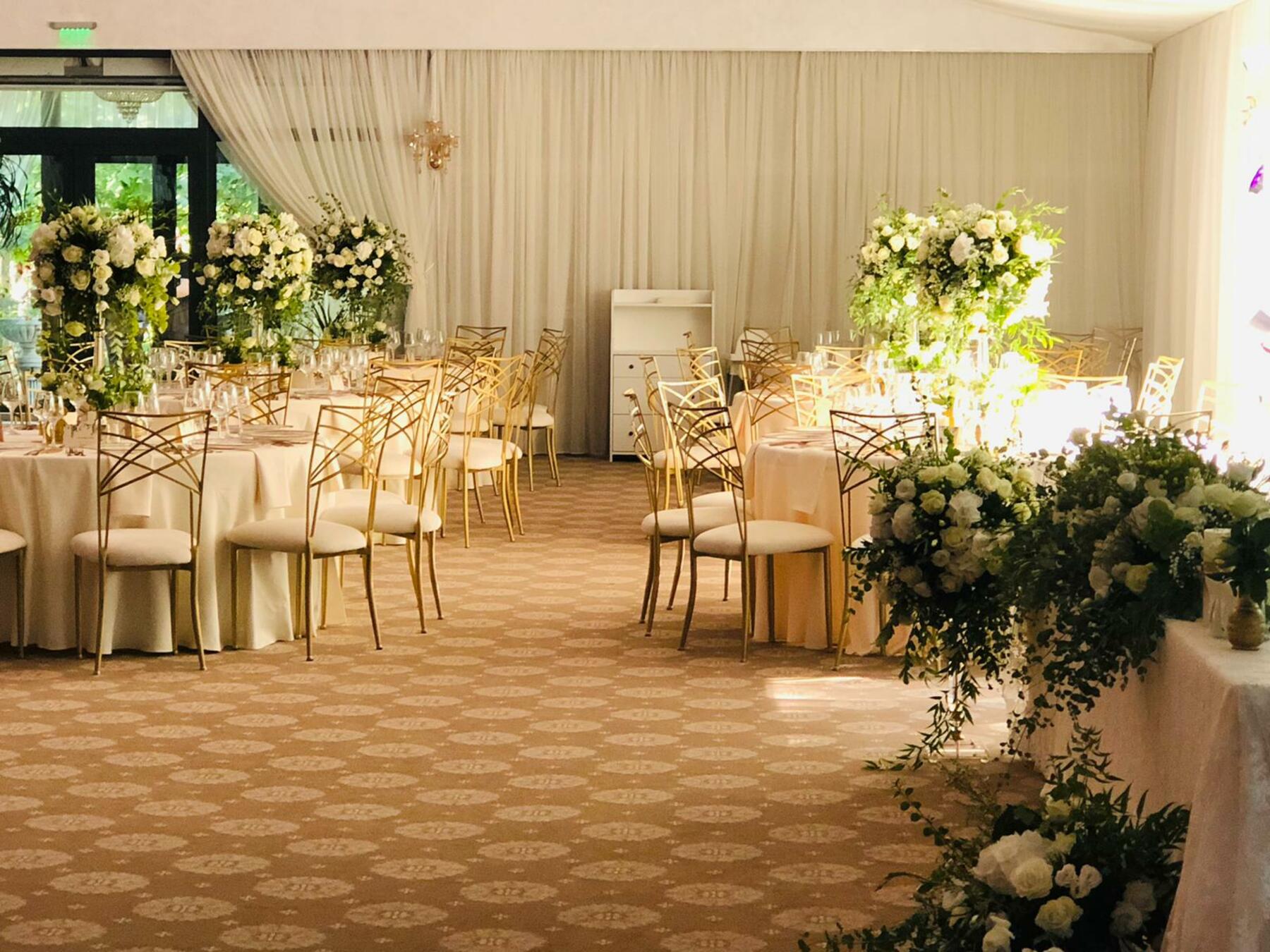Scaune Gold model Chameleon, farfurii suport si tacamuri Gold, fete de masa, servete si huse pentru sezut scaune diverse nuante, in functie de tematica evenimentului.