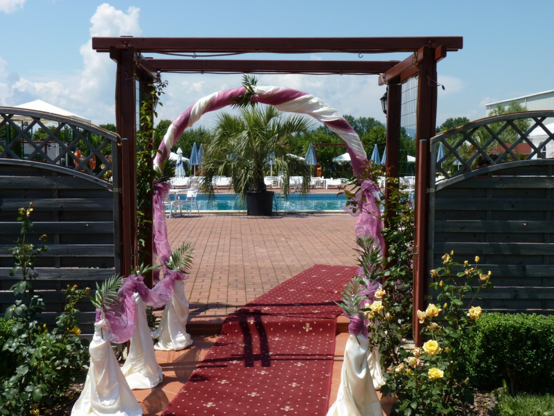Spațiu exterior ce include o superba grădină interioară cu piscină în aer liber, ideală pentru petreceri și evenimente sezoniere. Oferă posibilitatea organizării de ceremonii în aer liber înconjurate de natură.