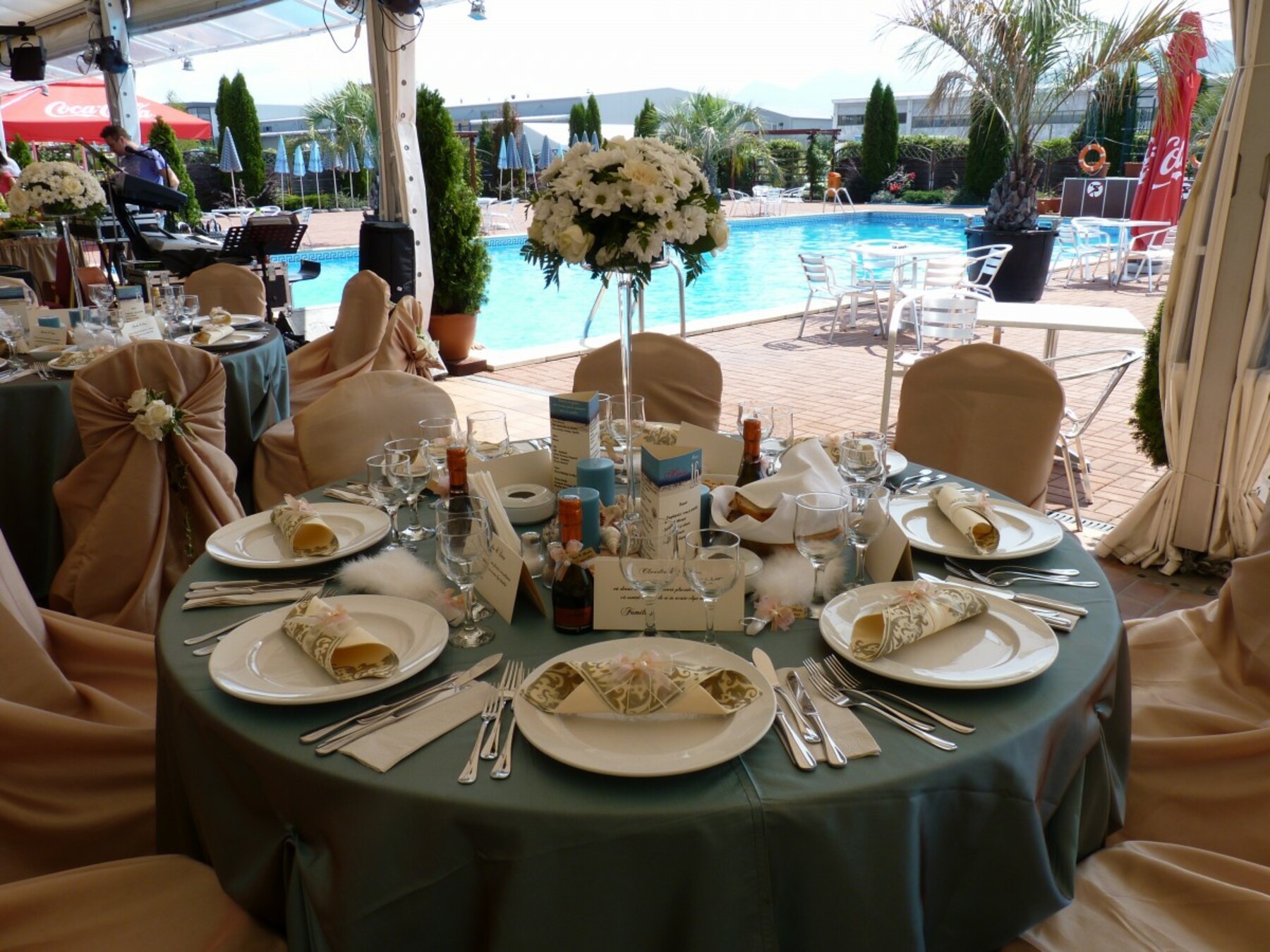 Cort de evenimente cu o capacitate de 100-250 de persoane, așezat în fața piscinei, creând o atmosferă feerică.
