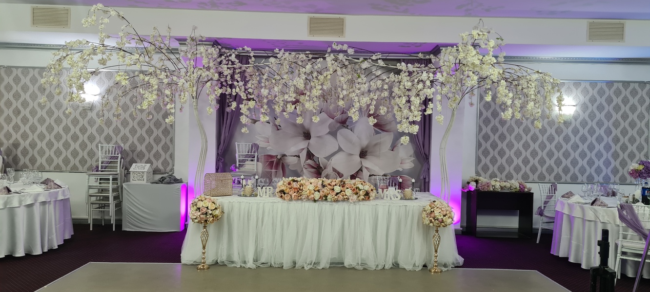 Un decor de poveste. Masa de prezidiu ce contine 2 copaci de ciresi, 1 aranjament pe mijloc, casuta bani, lumanari decorative, 2 suporti cu 2 aranjamente in fata mesei.