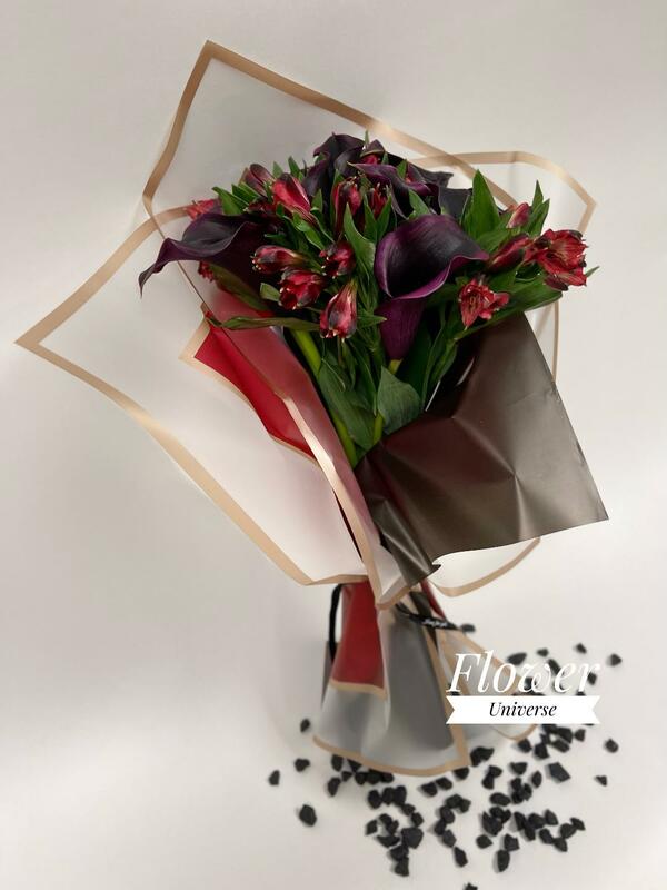Buchet special pentru o persoană care adora culorile închise. Calele sunt cele care predomină în acest buchet, iar culorile pot sa difere in funcție de dorința clientului și disponibilitatea florilor.