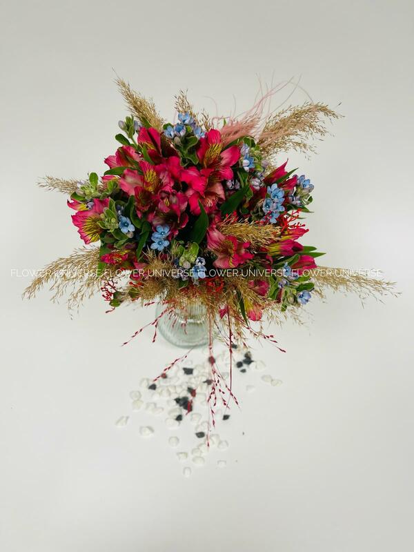 Buchet altroemeria roșie, oxypetalum bleu, ruscus și pampas uscat. Buchetul se realizează doar pe comandă