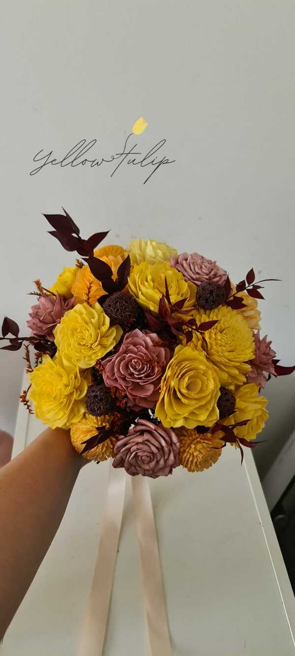 Produsele sunt realizate cu flori din fâșii de lemn de tapioca, care tratate cu o soluție pe bază de glicerină vegetală, capătă finețea și flexibilitatea petalelor naturale de flori iar în combinație cu verdeata naturala stabiliata, acestea nu doar ca vor căpăta un aspect extrem de natural, dar în plus, pot fi păstrate pentru totdeauna!