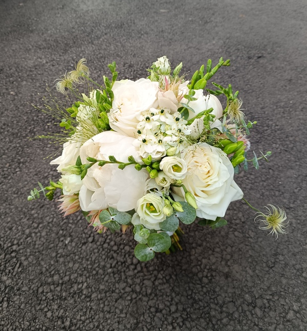 Un buchet compus din 3 trandafiri albi, 3 eustoma alba, 3 bujori albi, 5 frezia alba, 2 clematis, 3 ornitogalum, 3 panicum, 3 serruria, eucalipt și saten asortat.