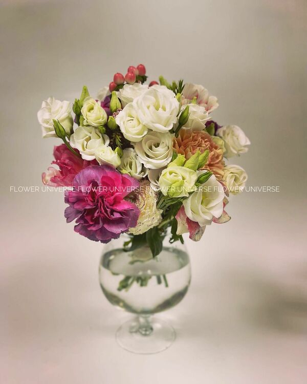 Buchet realizat din flori naturale, alcătuit din garoafe roz, nude, lisianthus și ranunculus. Buchetul se poate realiza doar pe bază de comandă.