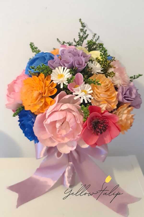Produsele sunt realizate cu flori din fâșii de lemn de tapioca, care tratate cu o soluție pe bază de glicerină vegetală, capătă finețea și flexibilitatea petalelor naturale de flori iar în combinație cu verdeata naturala stabiliata, acestea nu doar ca vor căpăta un aspect extrem de natural, dar în plus, pot fi păstrate pentru totdeauna!