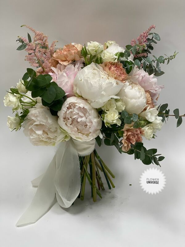 Buchet oval realizat cu bujori albi și roz, garoafe nude, baby eucalipt. Se realizează doar pe comandă