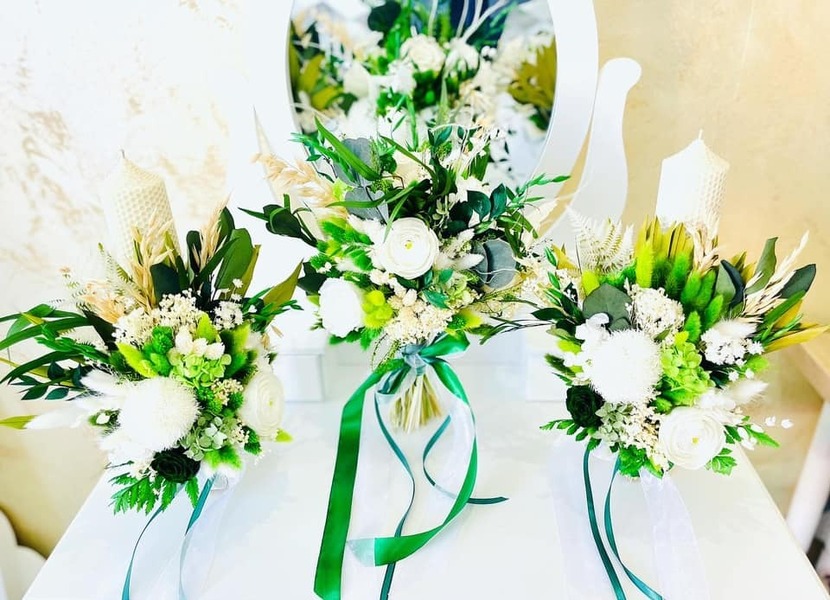 Decorate cu flori criogenate și uscate, cu panglică de cea mai bună calitate la alegere (satin, dantela, voal chiffon, matase etc) acestea susțin atmosfera din jurul lor și se potrivesc perfect pe lângă faptul că sunt eficiente la orice nuntă.