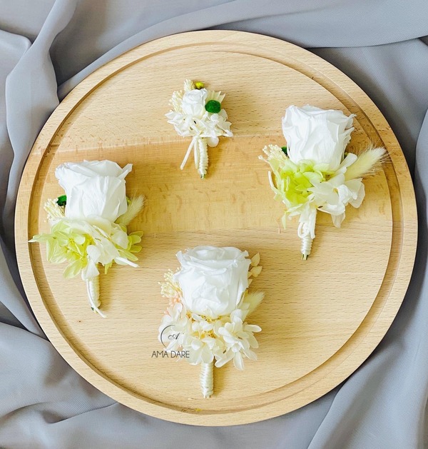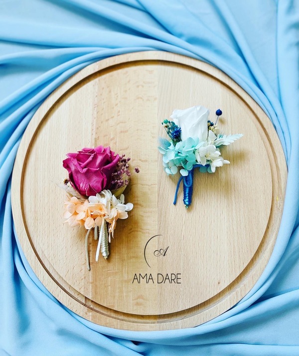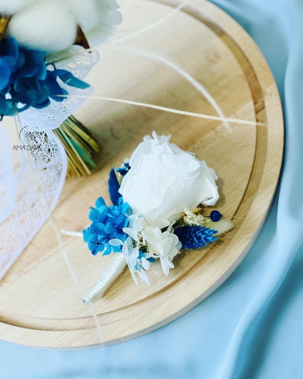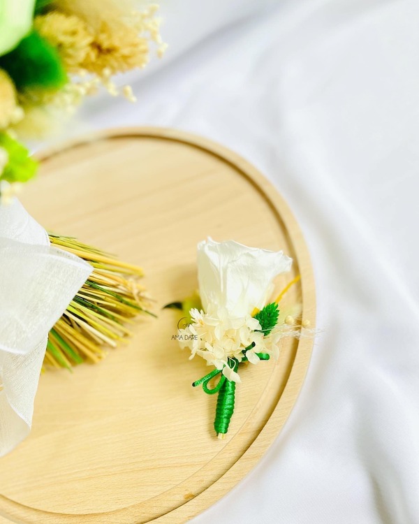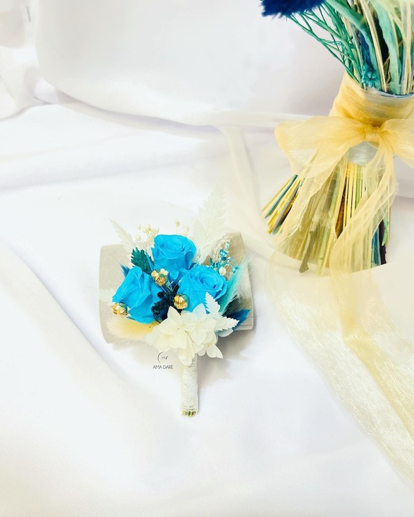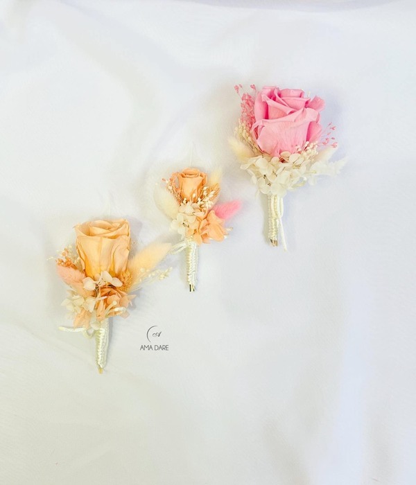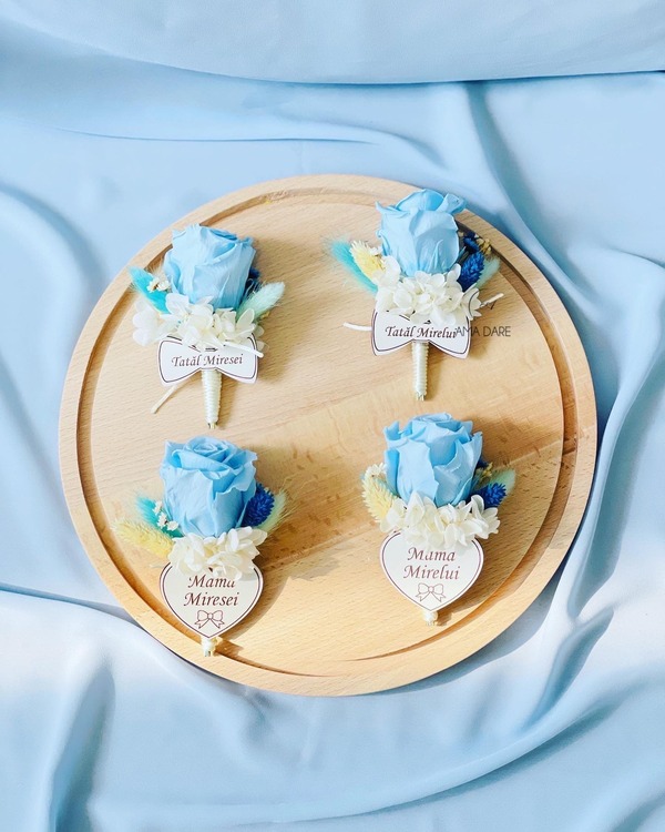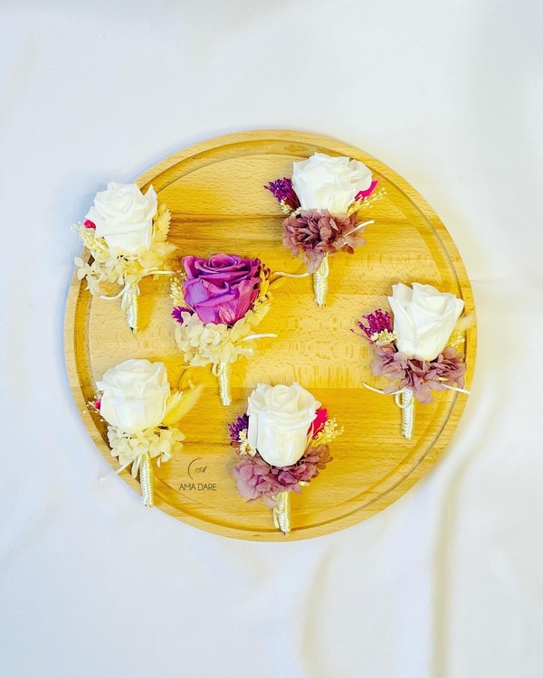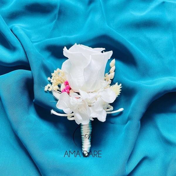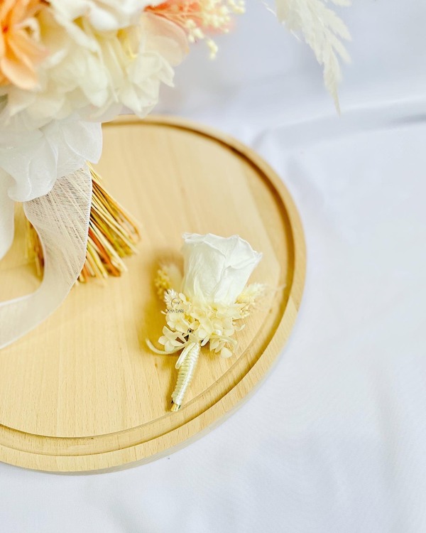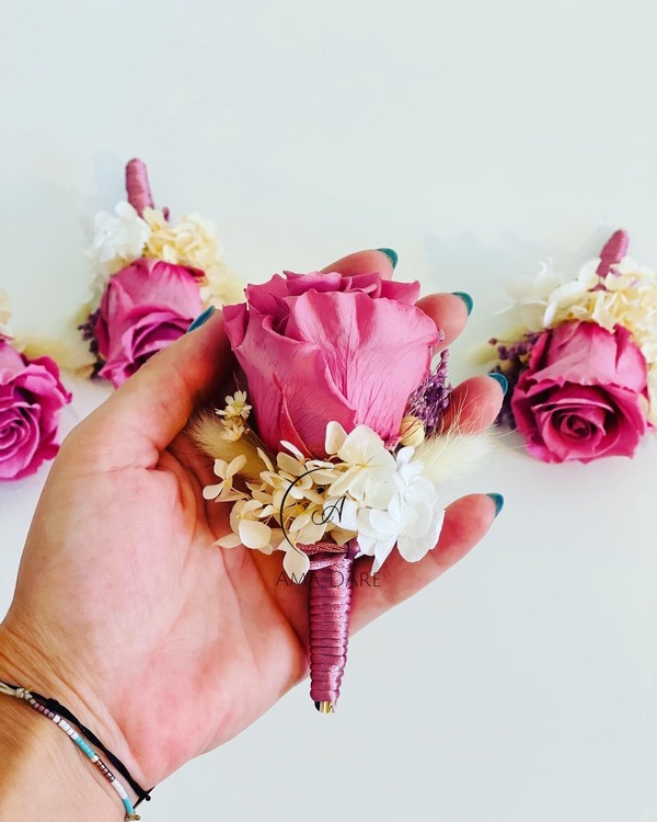 Optează pentru floare de pus în piept cu trandafir mare criogenat și flori uscate pentru un decor care va completa perfect emoția evenimentului.