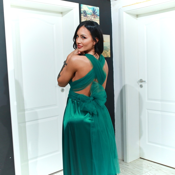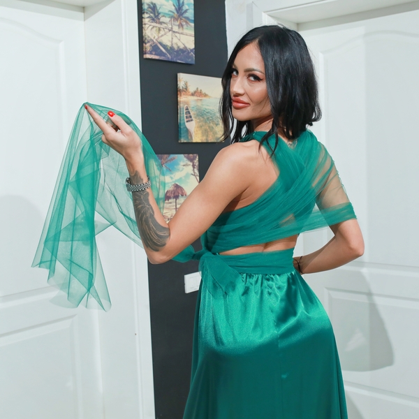 Rochie Versatilă lungă cu bretele tulle Satin RVBT01 Rochie versatila, lunga din material Satin Premium cu bretele din tulle. Se poate executa si in culori albastru, roz, verde, bordo, mov, lila,rosu,roz prafuit, albastru regal etc. Lungimea fustei din talie este de 120 cm. Rochia face parte din categoria rochii versatile.