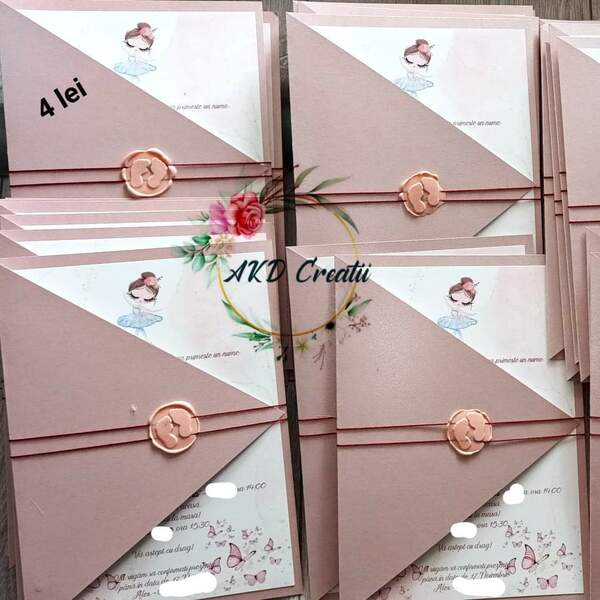Invitația aceasta are dimensiunile aproximative 15x19 cm, cartoanele folosite sunt de 250g, respectiv 210g.