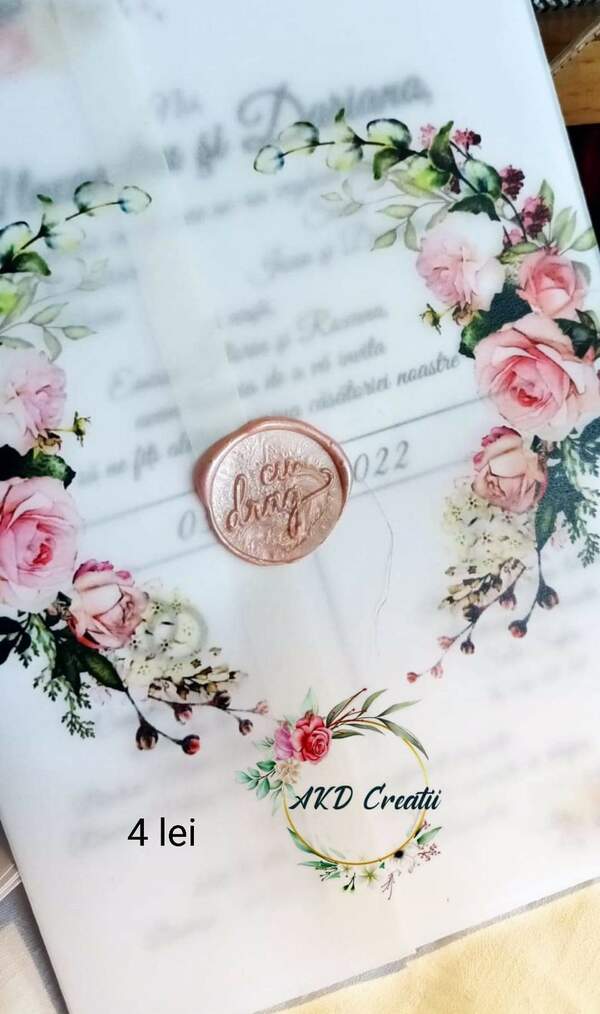 Invitație de nuntă cu coperta din calc și sigiliu turnat. Textul, fontul și aranjarea in pagina sunt la alegerea dvs. De asemenea, putem modifica grafica in funcție de tematica pe care o doriți. Dimensiunile invitației sunt 13x20 cm