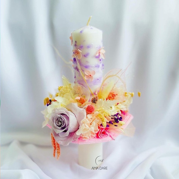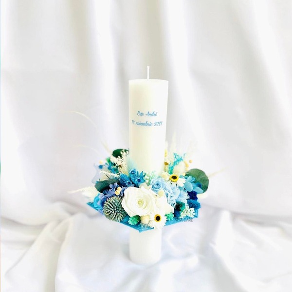 Alege o lumânare realizată pe structura spider și decorată cu flori criogenate și uscate. Acestea reprezintă punctul de plecare când vine vorba de un botez iar decorul poate fi întregit de ele.