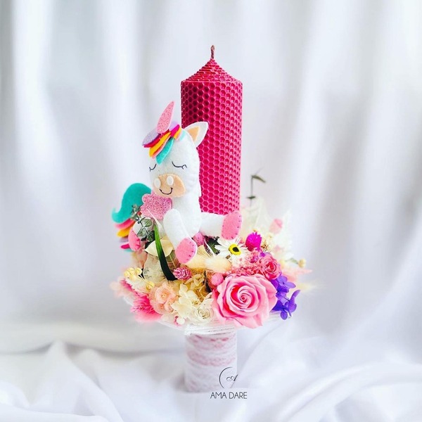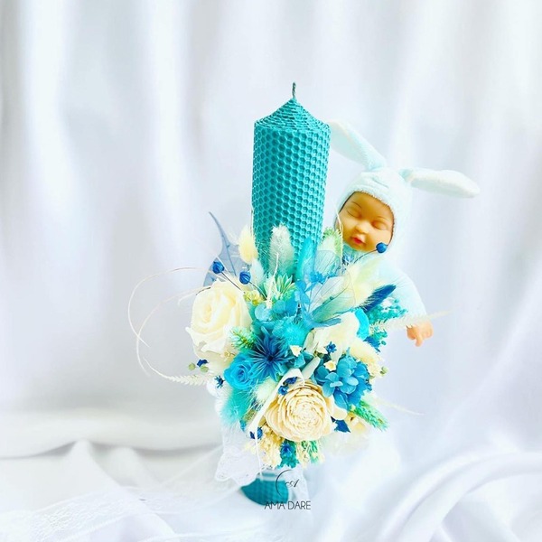 Decorate cu jucării din fetru sau pluș pe diferite structuri lumânarea de botez din ceară naturală susține coloristica și eleganța evenimentului tău, pentru ca bucuria să fie din ce în ce mai mare.