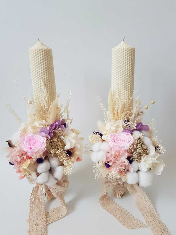 Set lumanari din ceara naturala decorat cu flori criogenate/uscate