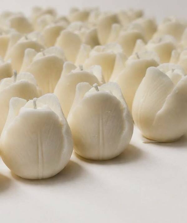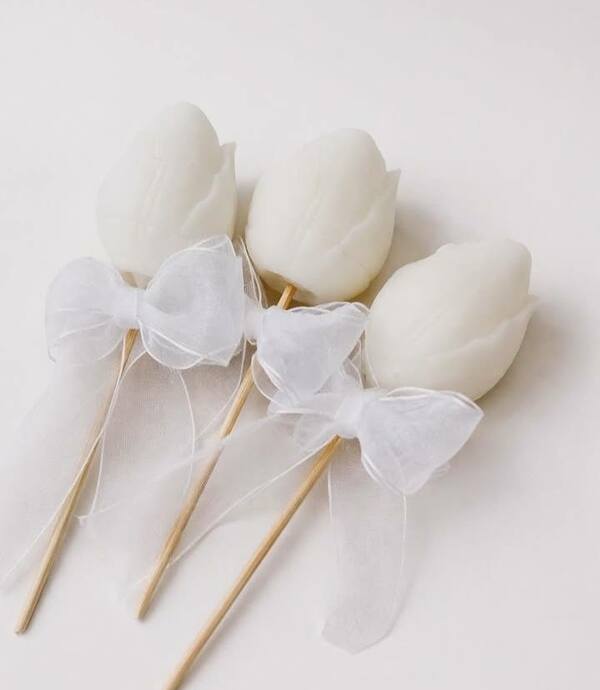 Lumânări albe, în formă de lalea, fixate pe bețișoare din lemn. Fiecare lumânare este decorată cu o fundă delicată din organza albă, care îi oferă un aspect elegant și romantic. Datorită designului său simplu și culorii rafinate, aceste lumânări sunt alegerea ideală ca mărturii de nuntă, prin care mirii își pot exprima recunoștința față de invitați. Lumânările creează o atmosferă festivă, discretă și rămân o amintire plăcută a zilei speciale.