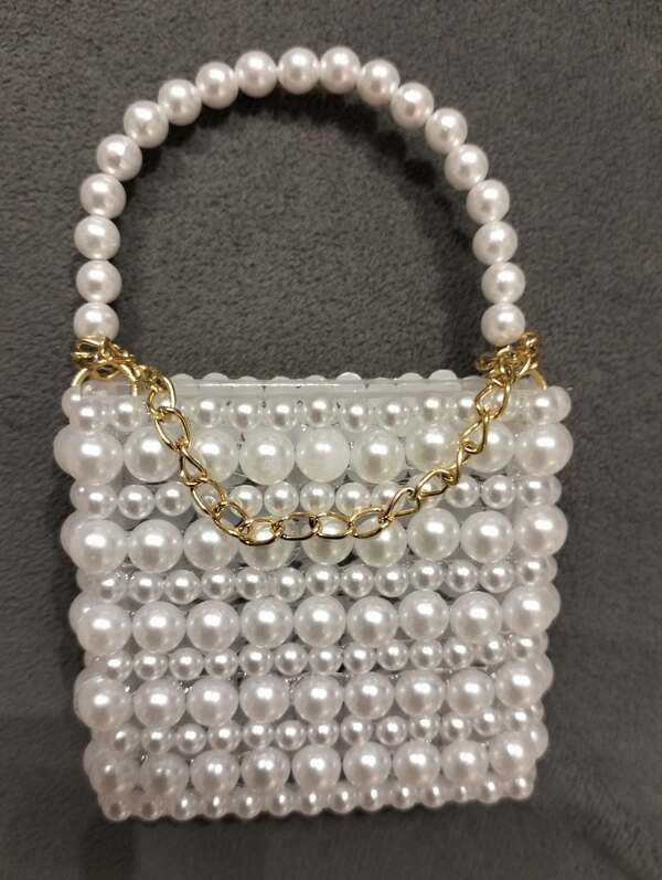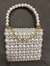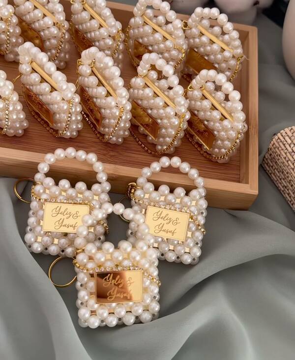 Geantă cu perle, etichetă exclusivă, nume și dată personalizate.