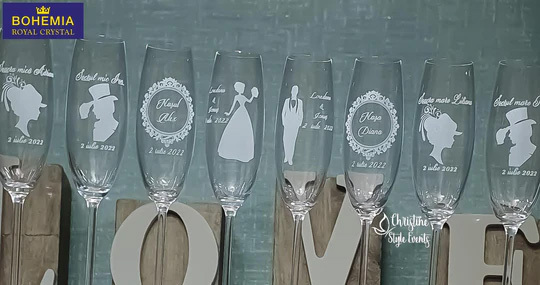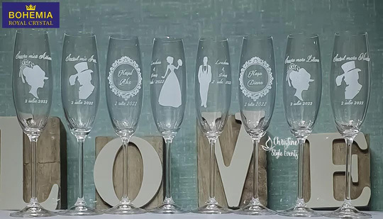 Paharele de șampanie gravate aduc intotdeauna un plus de eleganță și rafinament evenimentului dumneavoastră putând fi folosite în ziua marelui eveniment pentru a face toasturile de nuntă dar vor putea fi folosite și în anii următori.