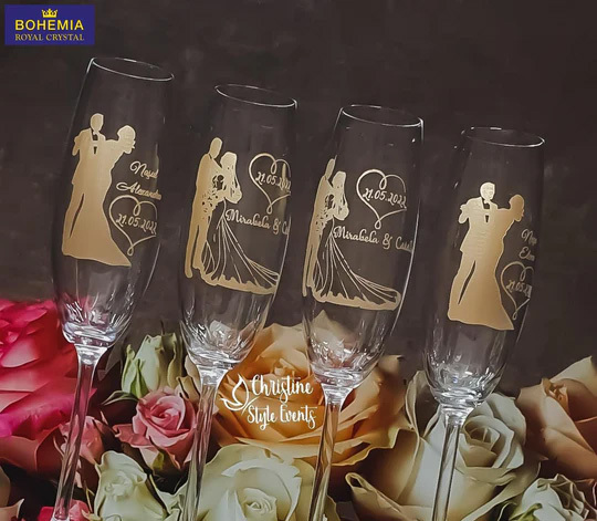 Pahare din cristal personalizate cu reflexii aurii, siluete.