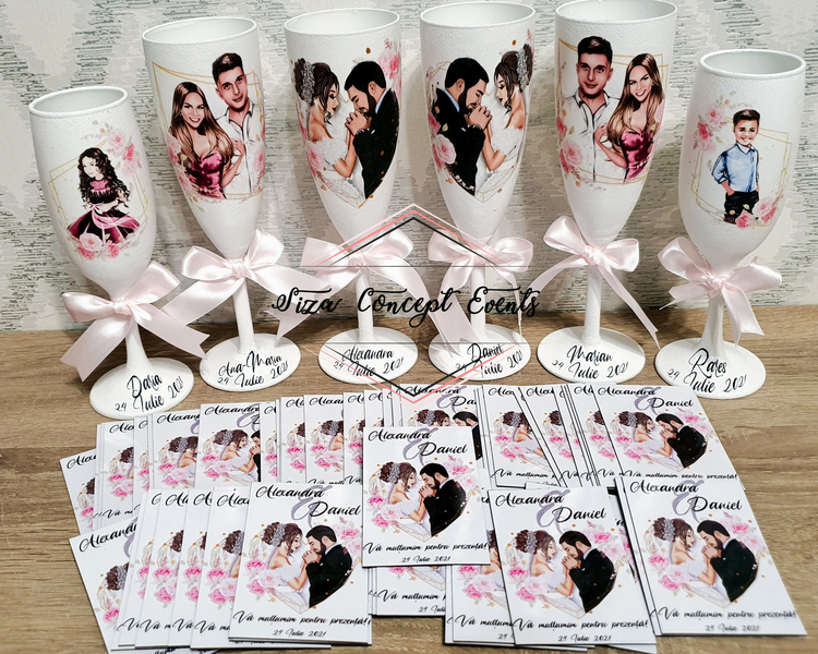Produsele sunt realizate la comandă și sunt personalizate 100%. Termenul de livrare se calculeaza de la momentul confirmării design-ului grafic de către prestator. Material pahare: sticlă. Prețul este per bucată.