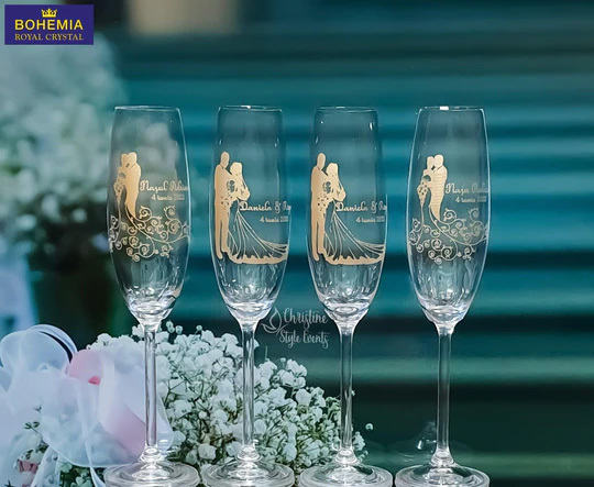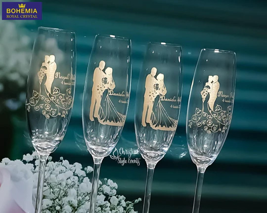 Pahare din cristal personalizate prin gravură şi apoi realizate în nuanță antique gold (tente aurii).