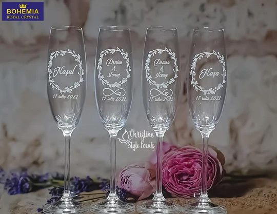 Paharele de șampanie gravate sunt întotdeauna un mare succes cu petrecerea miresei și cu invitații la nuntă, deoarece pot fi folosite în ziua nunții pentru a face toasturile de nuntă și vor fi folosite și în anii următori.Ce mod mai bun de a sărbători o nuntă decât să bem pentru o viață fericită alături de cei dragi.