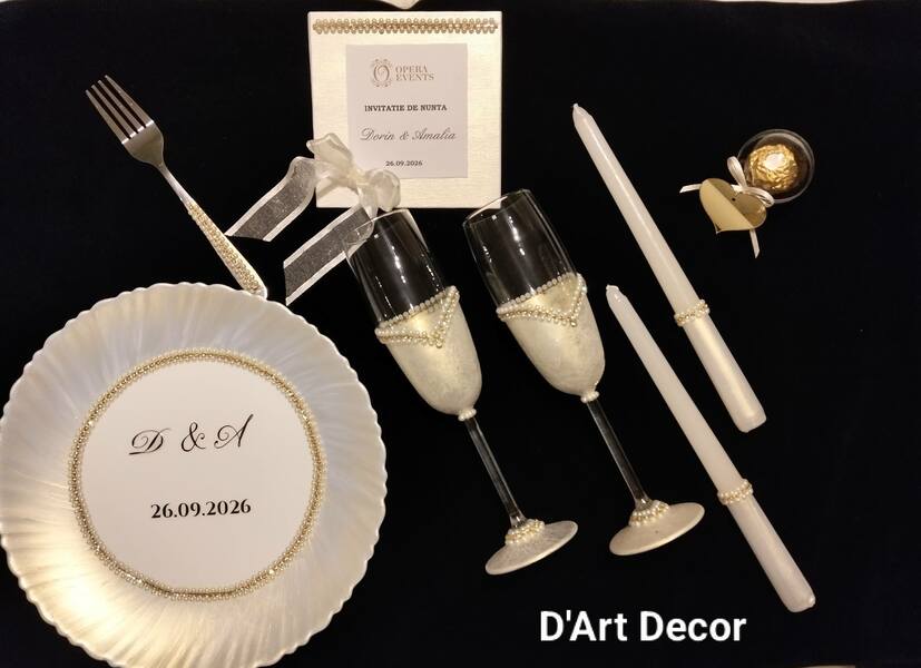 Toate piesele setului sunt realizate într-un stil unitar, creând o atmosferă elegantă și coerentă atât pentru ceremonie, cât și pentru masa festivă. Farfuria personalizată, paharele de șampanie decorate, lumânările și invitația elegantă contribuie la transformarea zilei nunții într-o amintire de neuitat.