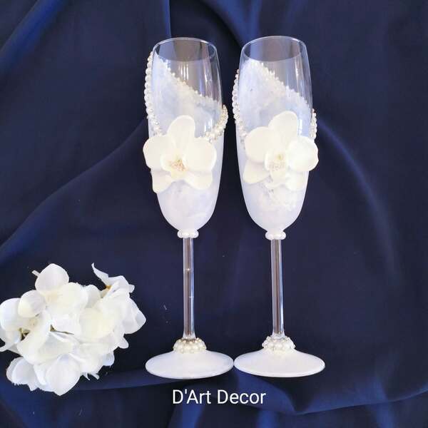 Paharele sunt decorate cu un design alb-lăptos special, completat de perle fine și accente strălucitoare. Elementul central este floarea de orhidee realizată manual, care oferă un aspect exclusiv și romantic.