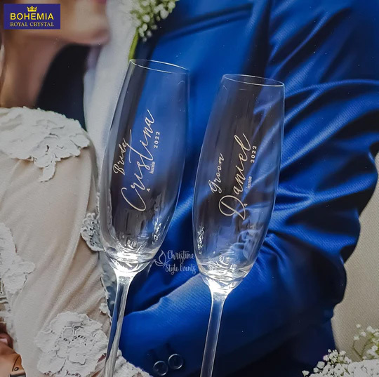 Pahare din cristal personalizate prin gravură şi apoi realizate în nuanță antique gold (tente aurii).
