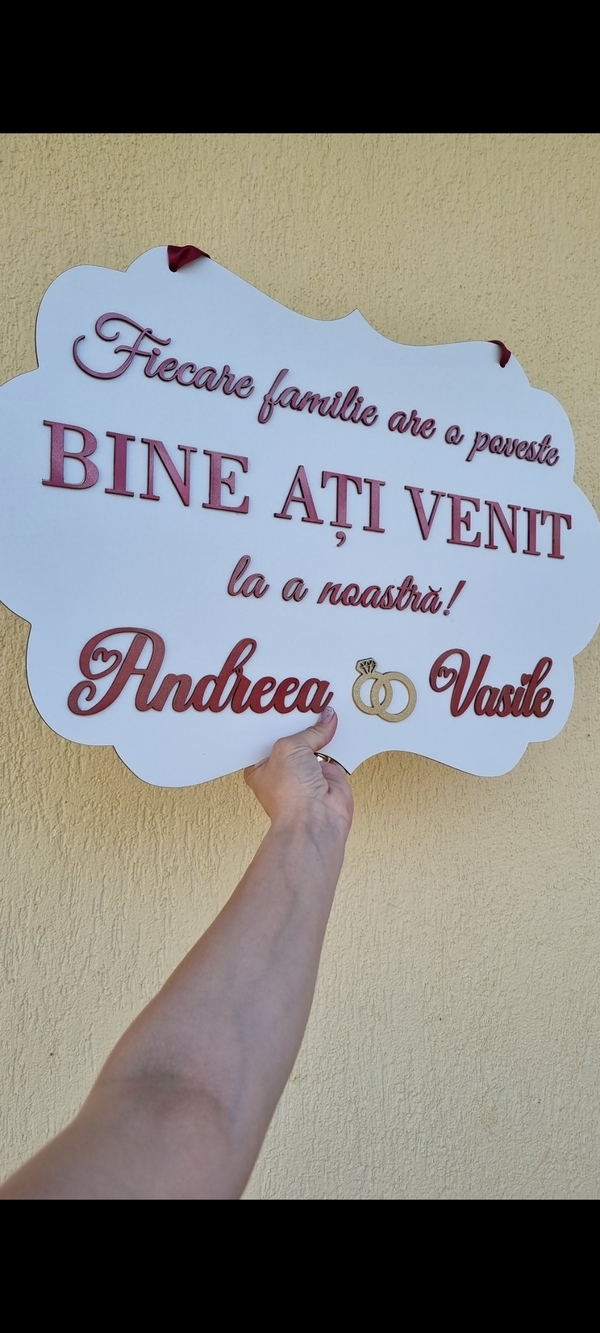 Adaugă un plus de stil și originalitate evenimentului cu pancartele noastre personalizate, realizate manual cu text în relief 3D. Fie că este vorba despre un mesaj de bun venit, un citat special sau orice alt text dorit, fiecare pancartă este creată cu atenție la detalii, în culori variate, pentru a se potrivi perfect tematicii tale.